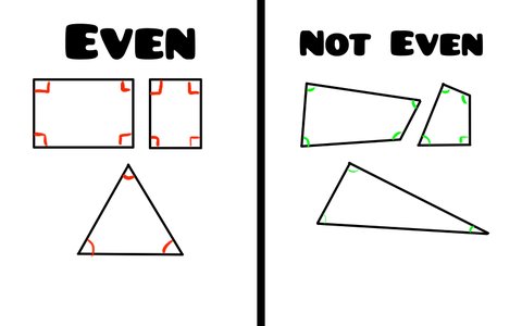 Angles: Shapes with the same interior angles inside them are even. This occurs frequently for good reason in manmade designs (e.g., squares & rectangles) but is much harder to find in nature.