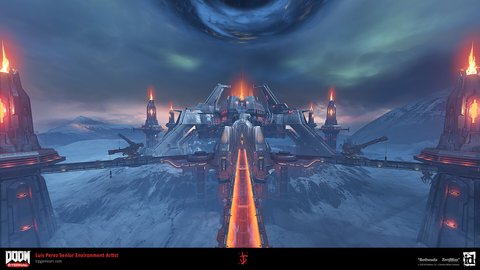 Symmetry can be seen frequently with objects such as entrances and doorways, but a specific art example is the DOOM Hunter Base from Doom Eternal. Its clear symmetry helps it stand out against the asymmetry in the background.