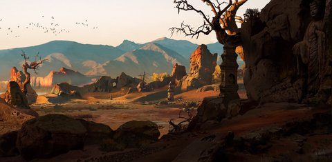 Here’s an example by Zhu Weiwei. The rocks in the foreground and background are arranged to lead your eye through the scene. They all share similar shapes, lighting, color, and texture, which helps make this more effective.