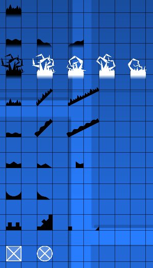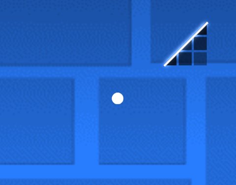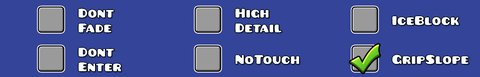 Slopes are located in the second and third tab of the editor. Just like blocks, they can be stood on and kill you if hit from the bottom or a side. Unlike blocks, they have a triangular hitbox which lets you slide on the angled part.