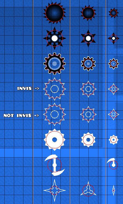 Saws have a lot of variations - 8 of them, to be exact. These all share different hitboxes between each other. These differences need to be kept in mind when making gameplay (especially with the last one), since choosing the right saw can make a positive or negative impact on the gameplay.