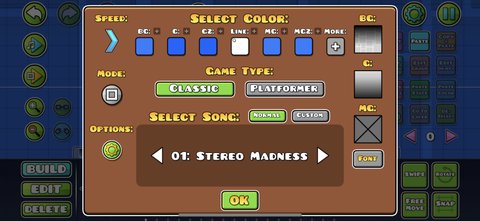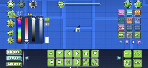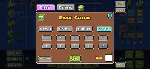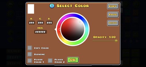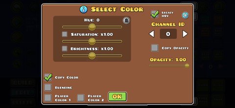 Player Color 1 & Player Color 2: The checkboxes in the bottom left will make the color channel copy each of the two colors of a player’s icon. This means that a player with different colored icons will see their respective colors in that channel. The color wheel will not change when the box is checked and the color will only appear in the editor/level.