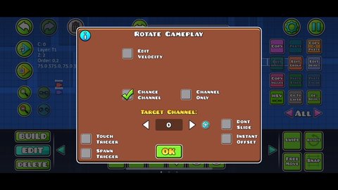You can set the channel of triggers with the “CH” counter in the :EditGroup: menu, next to the “ORD” counter. If you ever wonder why your triggers aren’t activating, check to make sure they’re on the correct channel. Only arrow triggers can change the level’s channel, not reverse triggers or reversed orbs.