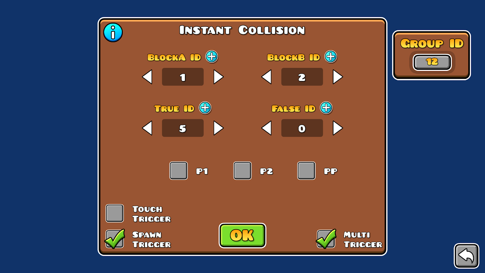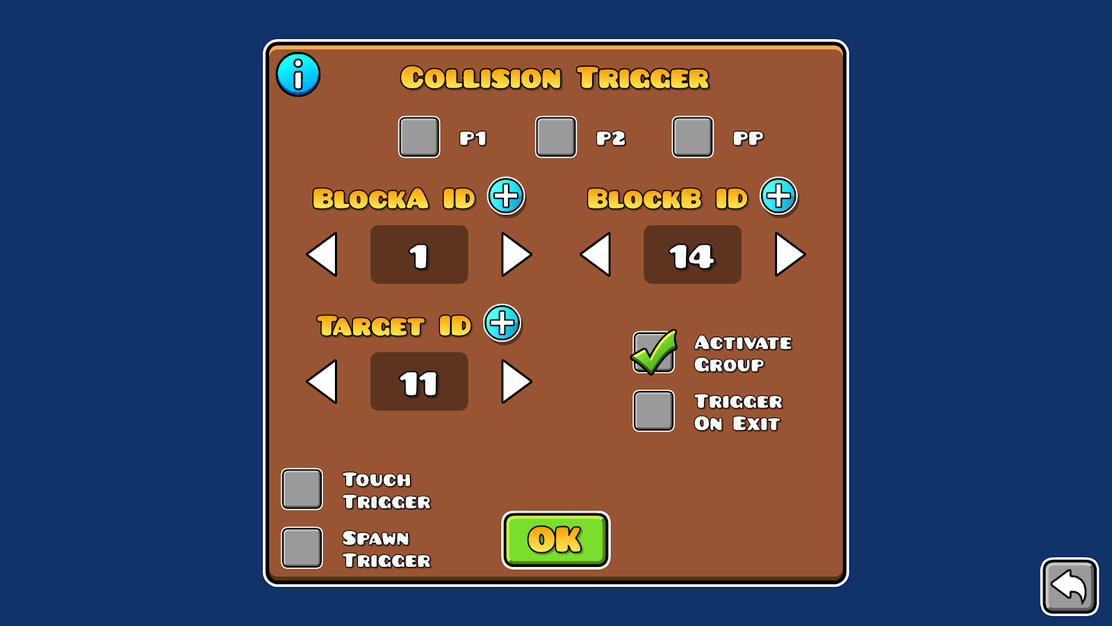 Buttons require different controls from what the player icon uses, depending on your use case, you might want to implement a different approach. In the following examples that don’t use the player as a cursor, we will use a collision block, collision can be either detected using the collision trigger and toggling on and off this block, or by spawning an instant collision trigger