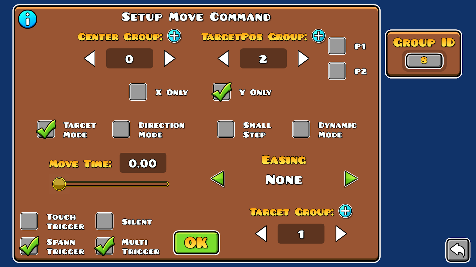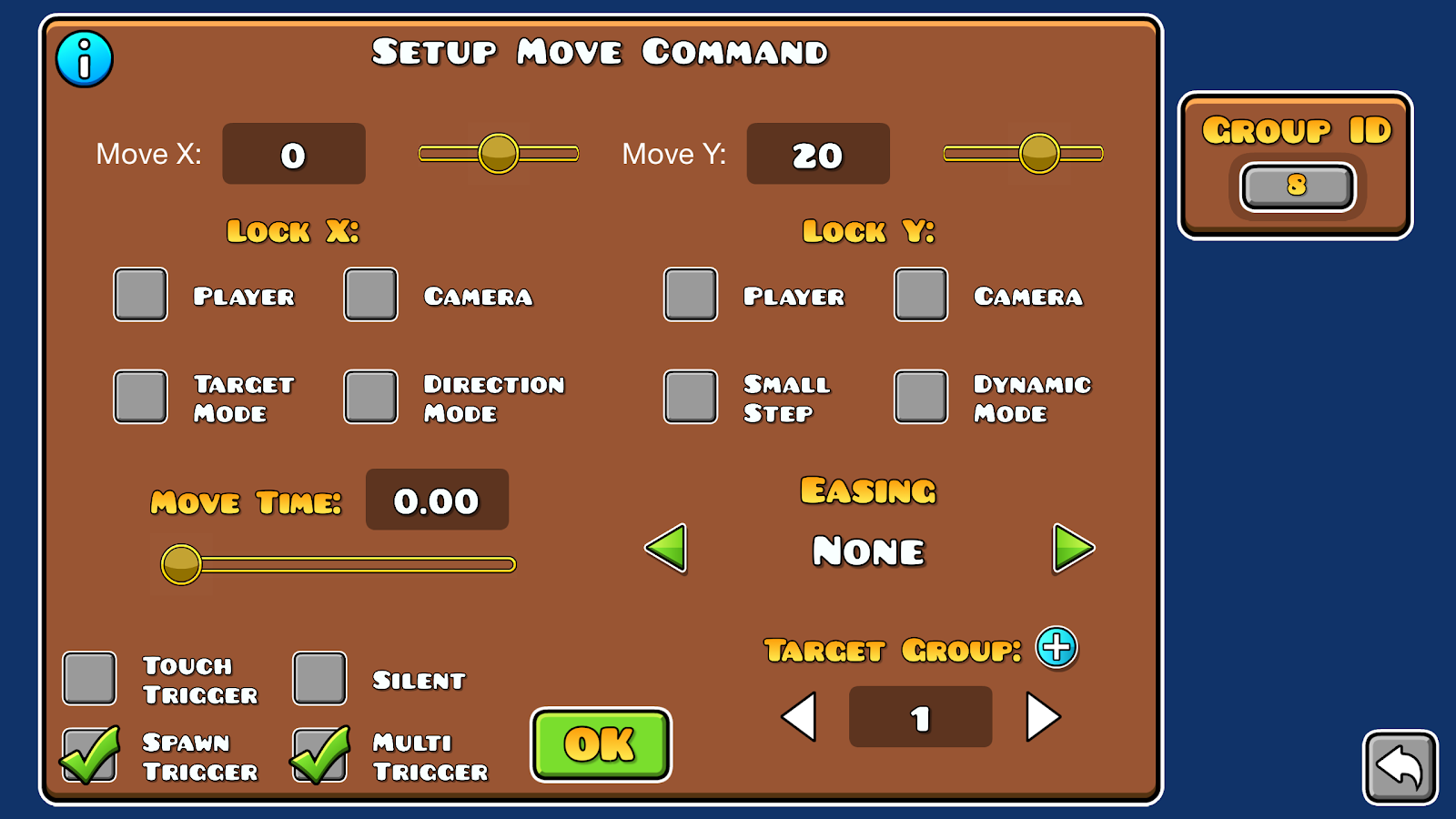 - the system now has to wait for the player to press a key to bind to, place an event trigger for each possible key, when the player selects a key (for example key1) which activates a move trigger with target mode that moves groupID c1 to X (which will be remapped to b1 from the previous spawn trigger)