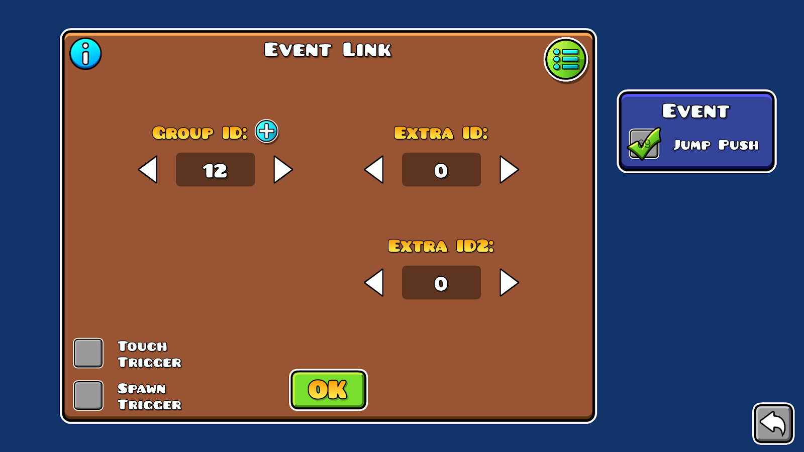 Choosing between using the touch trigger or event trigger mostly comes down to your level’s gamemode; touch is more suited for classic while event is made with platformer in mind, but both can be used depending on your needs.