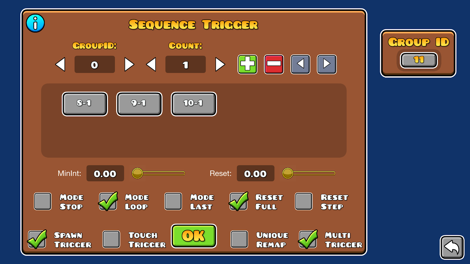 - the second event trigger detects [key] release and activates a stop trigger that stops groupID Z